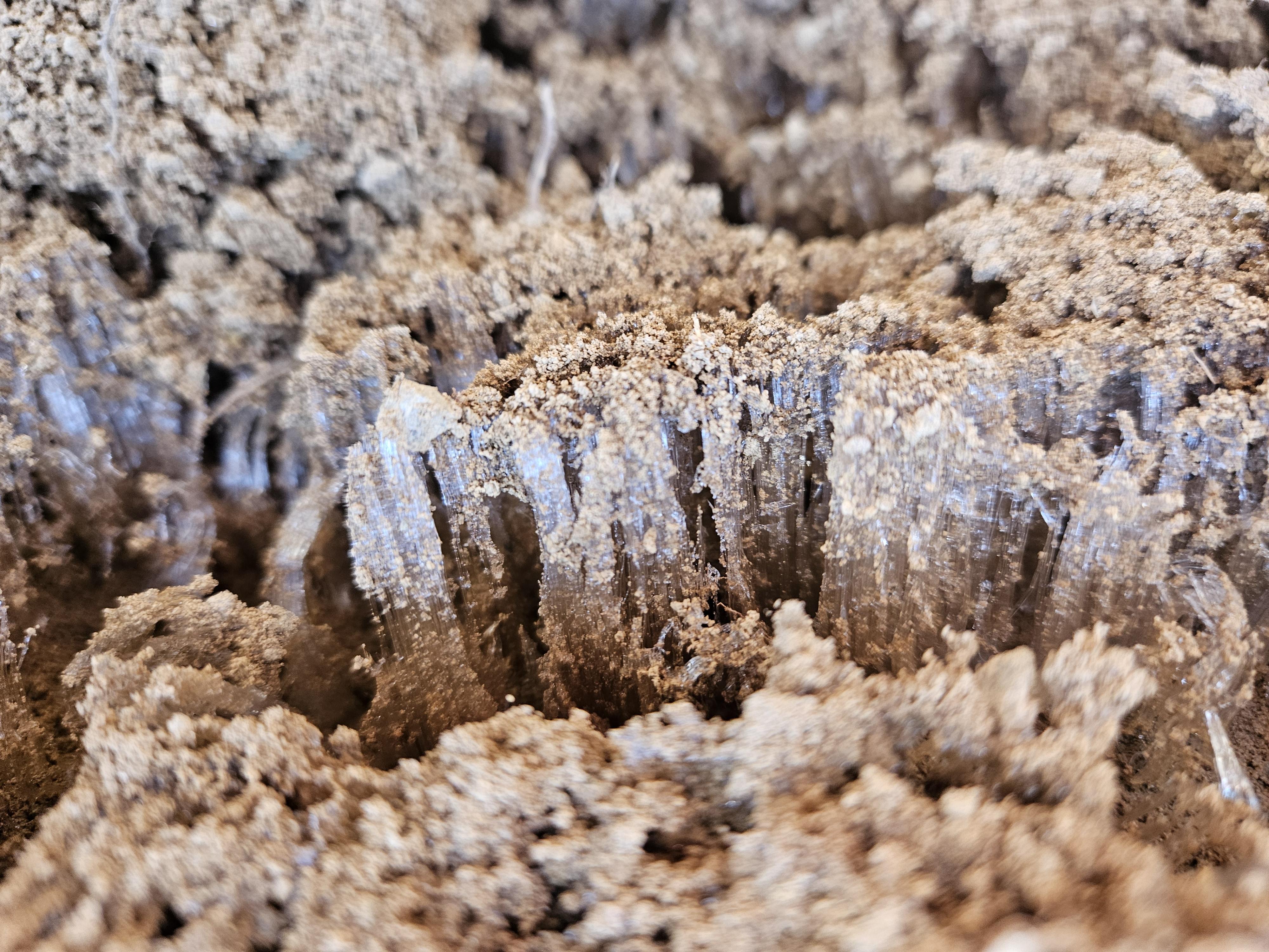 서릿발은 땅의 물이 얼면서 생긴다. 물이 언 것이라 만져 보면 딱딱하다. 물이 얼면 부피가 10% 정도 늘어난다. 그래서 흙을 밀어 올리게 된다. 봄이 되어 얼음이 녹으면 흙 사이에 가는 틈이 생긴다. 새싹은 이 틈으로 올라오게 된다. 서릿발의 도움이 없었다면 새싹은 땅 위로 올라오지 못했을 것이다. 서릿발이 받쳐주는 힘으로 이 세상 구경을 하게 된 것이다.