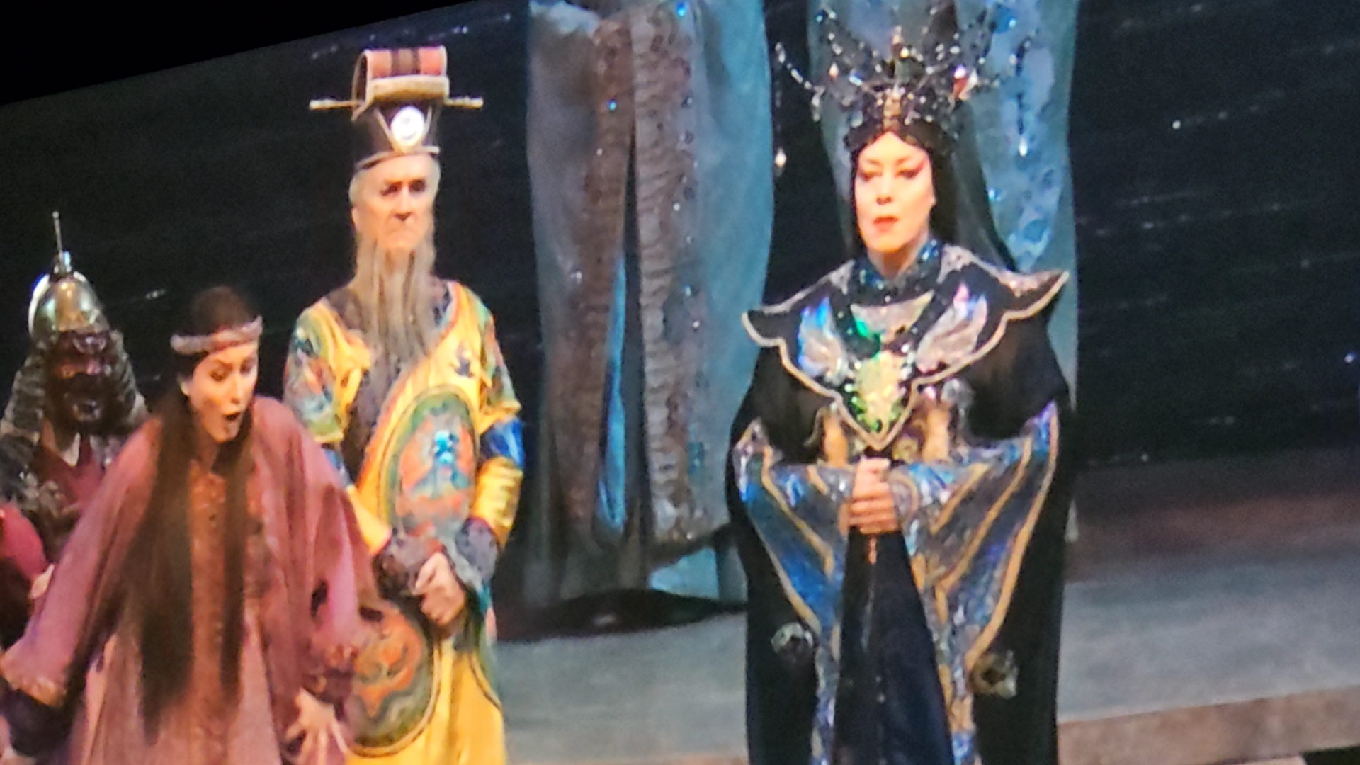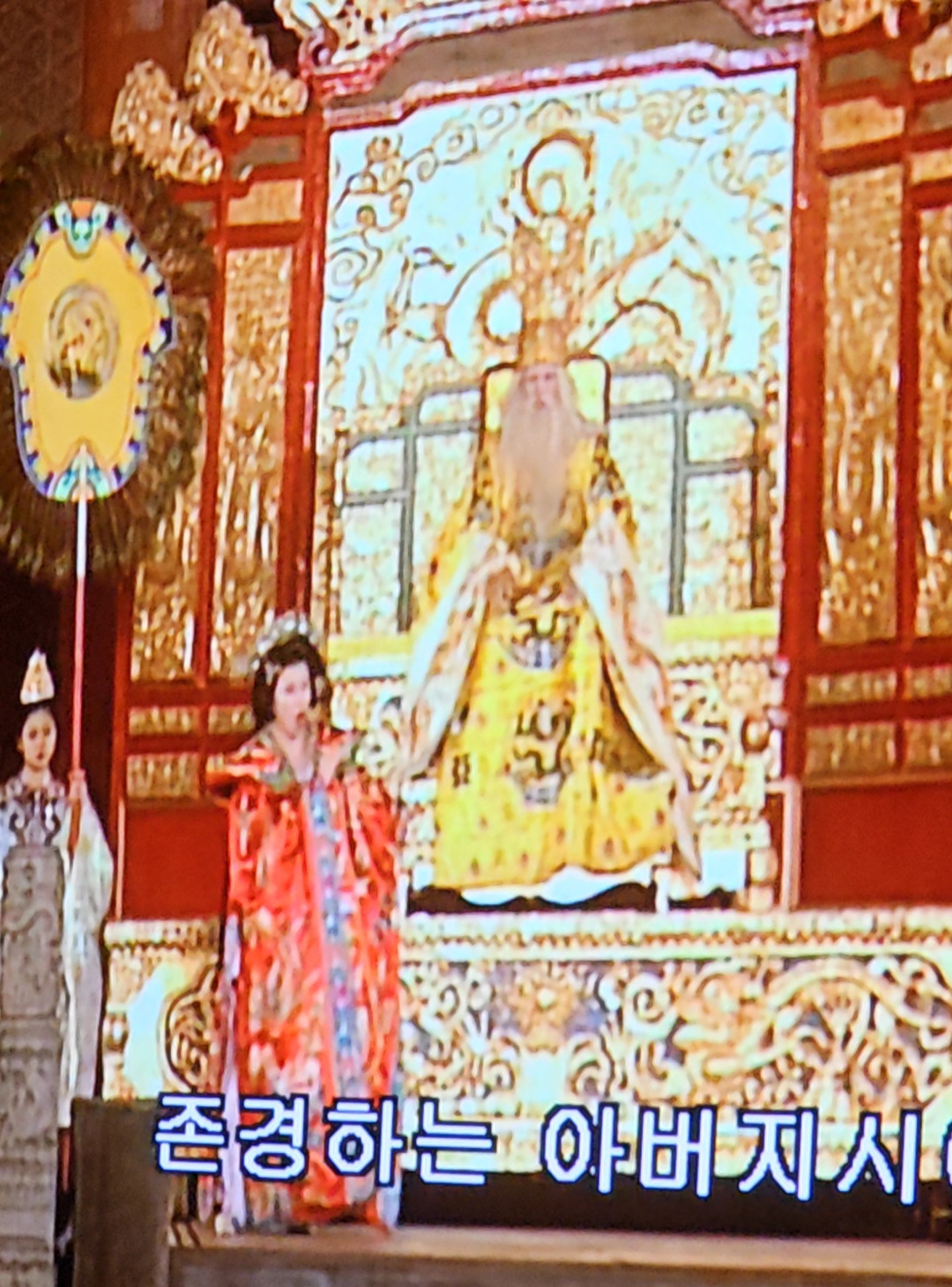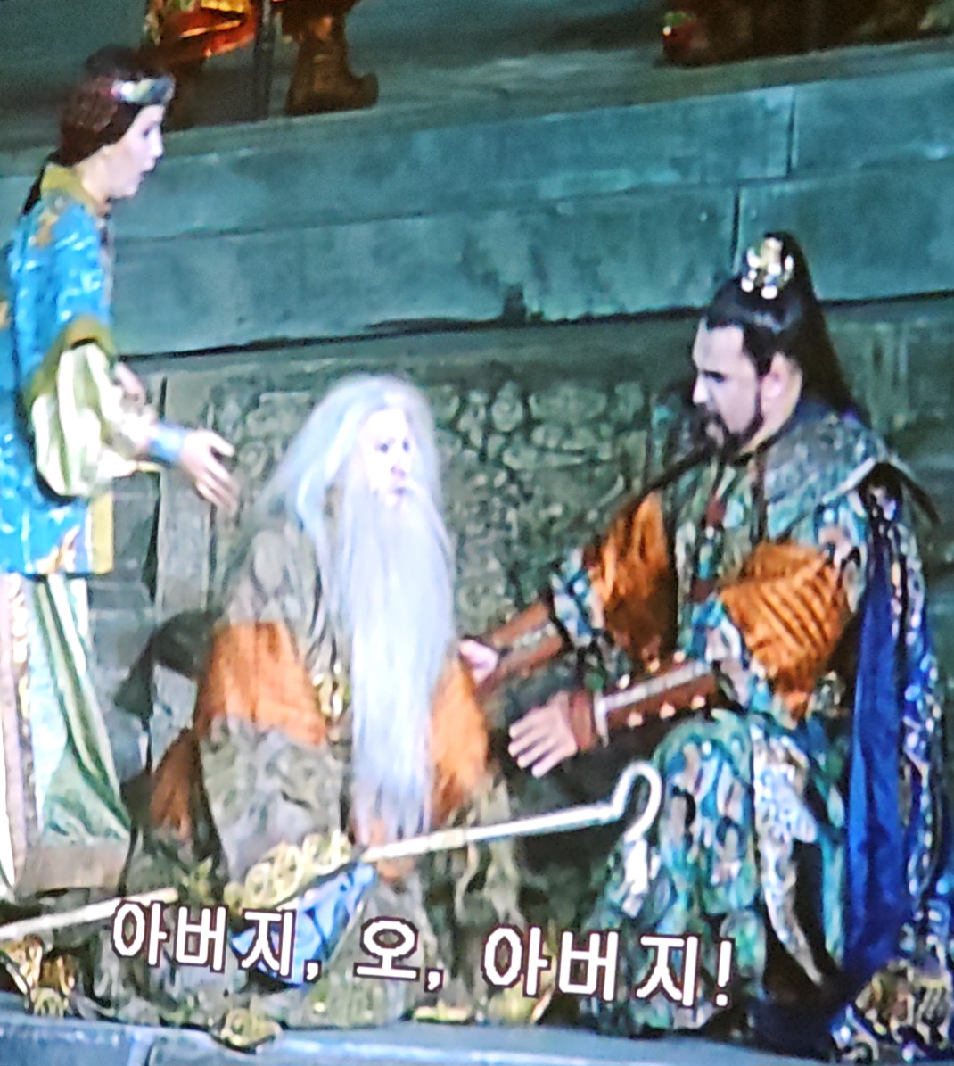 투란도트 공주가 차가운 말투로 첫 번째 문제를 말한다.
