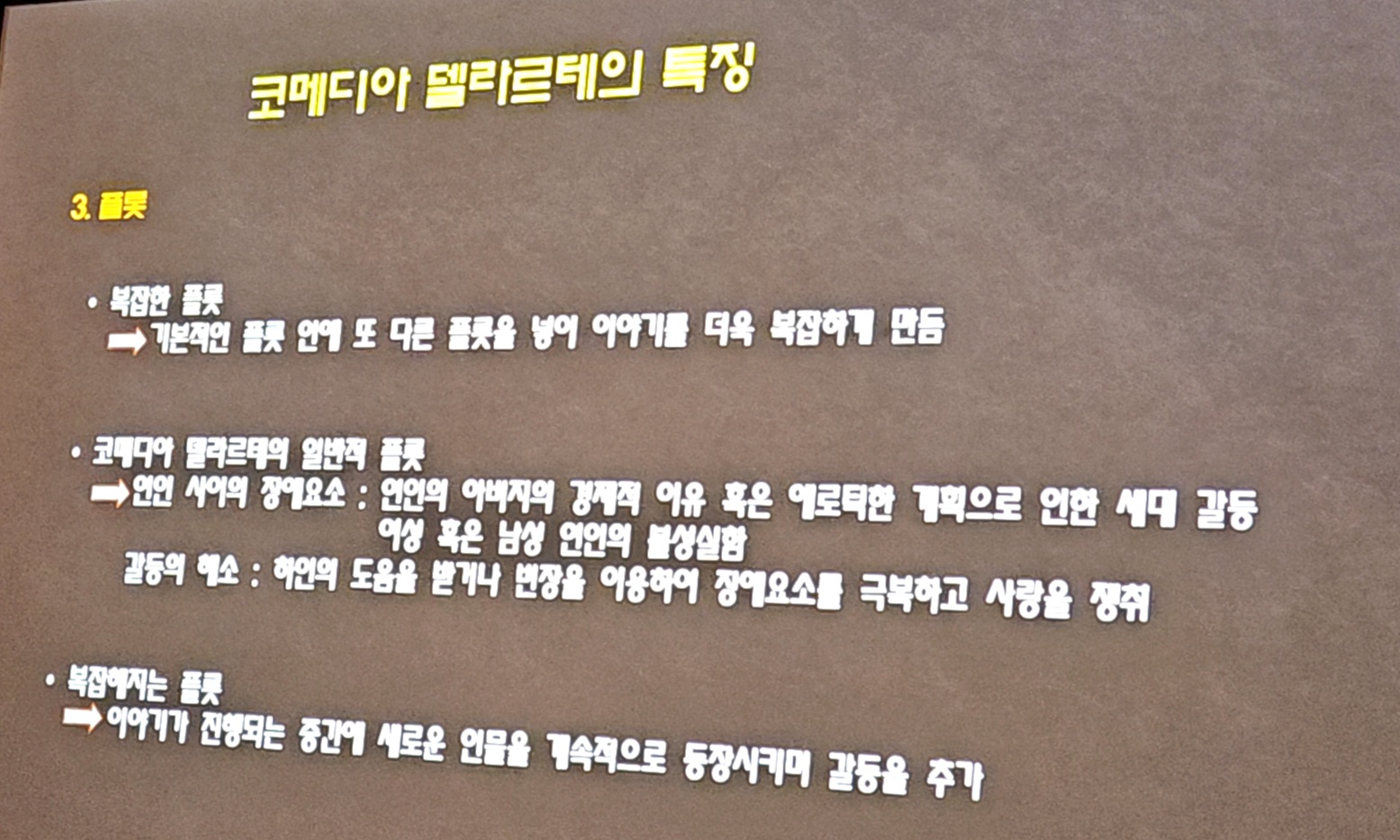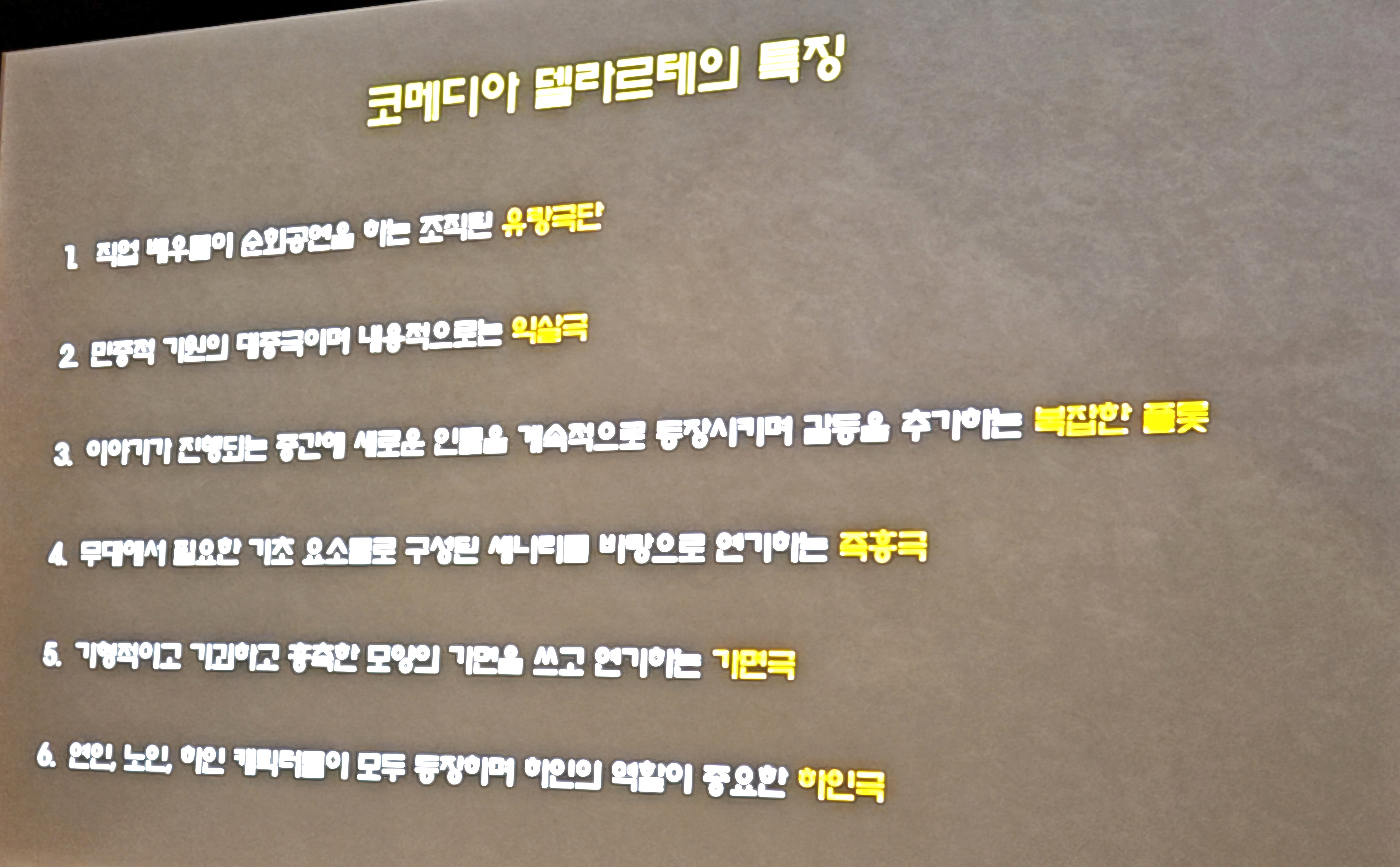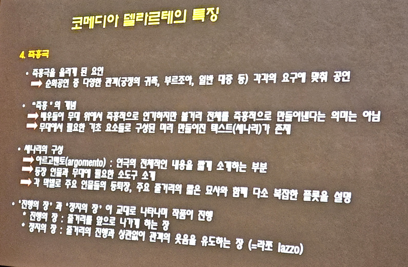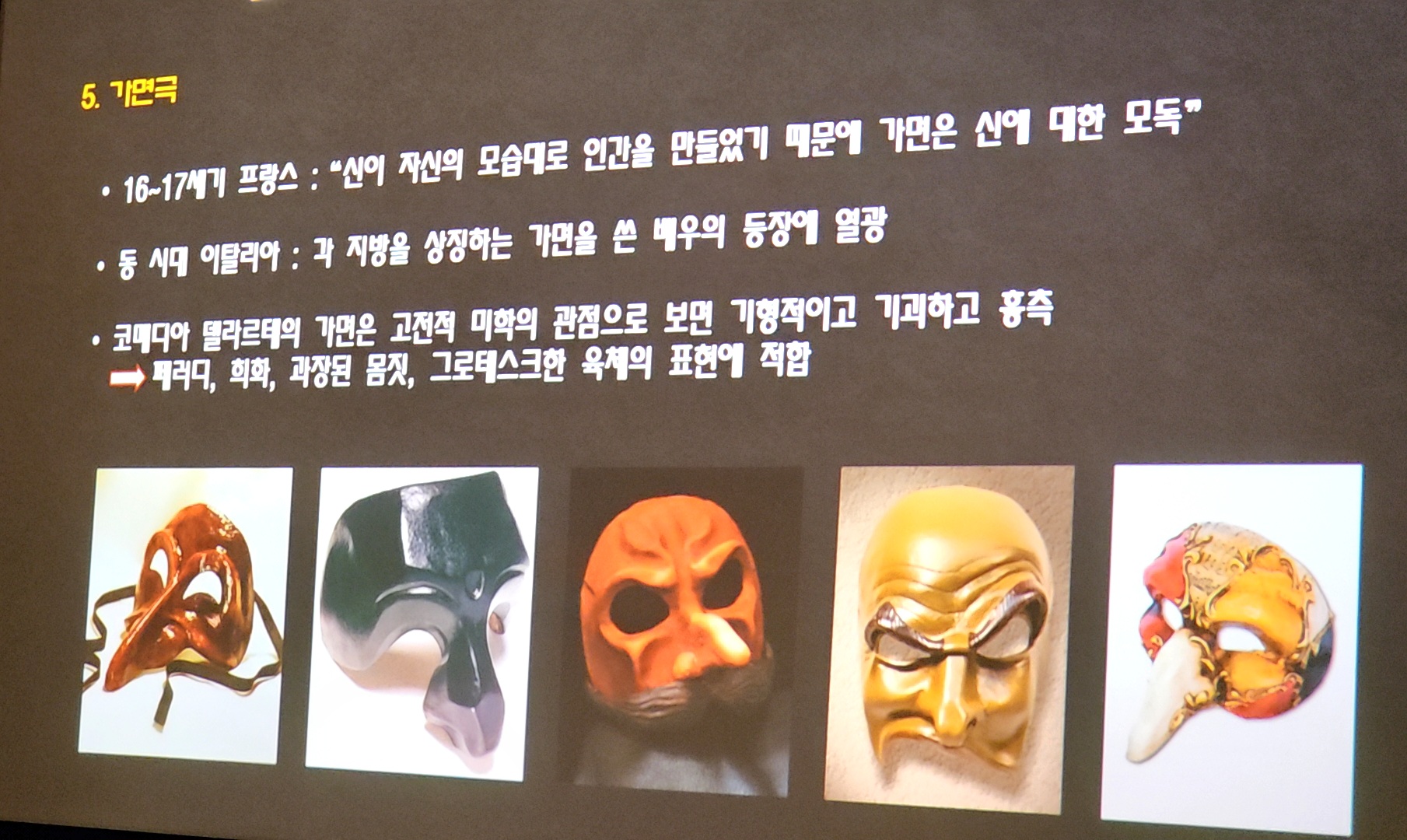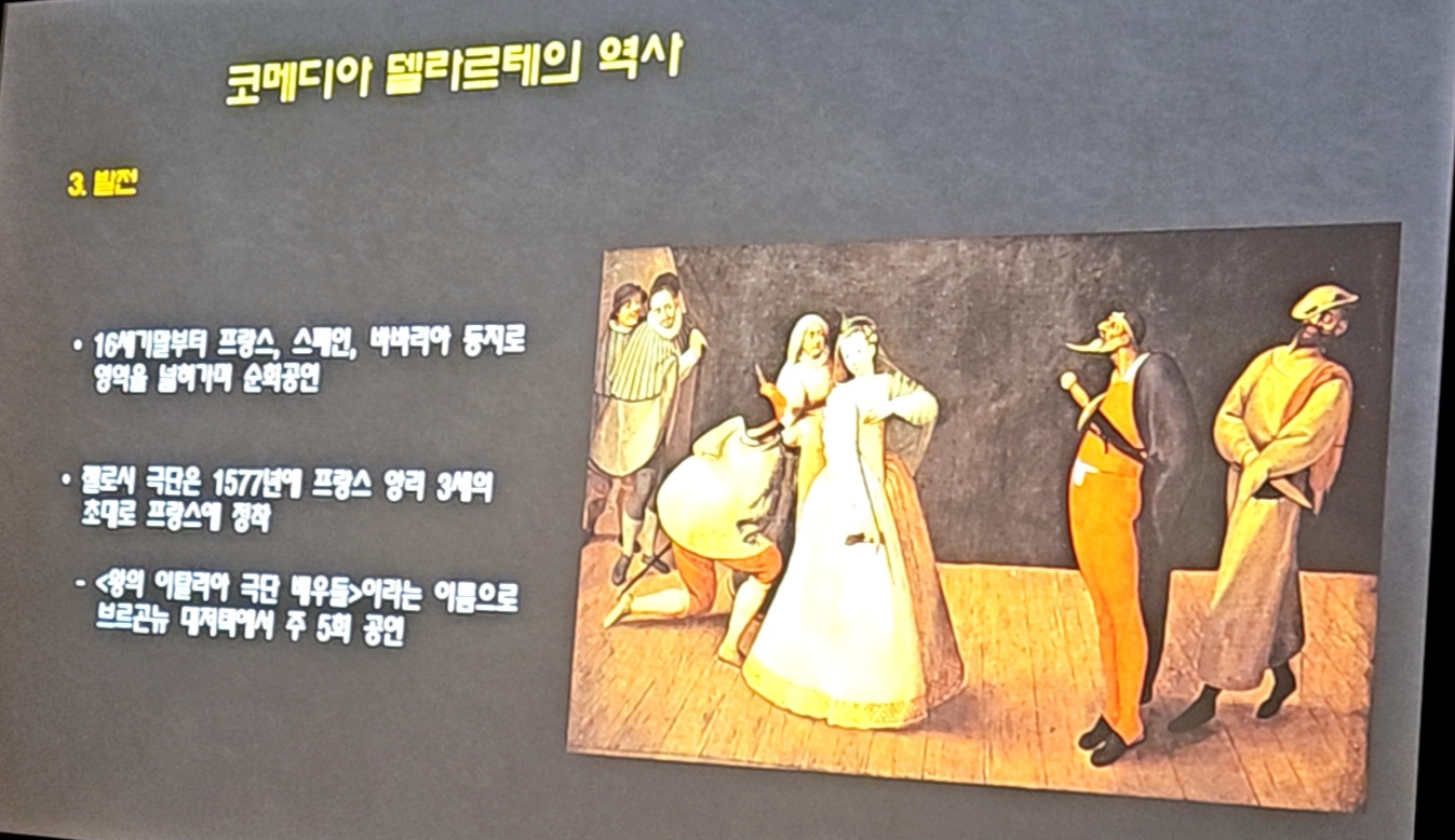 이번 시간에는 먼저 코메디아 델라르테의 전체적인 역사에 대해 살펴본 후, 가면극이고 즉흥극이고 대중극인 이 연극이 갖고 있는 여러 가지 특징들을 자세히 말씀 드리겠습니다.